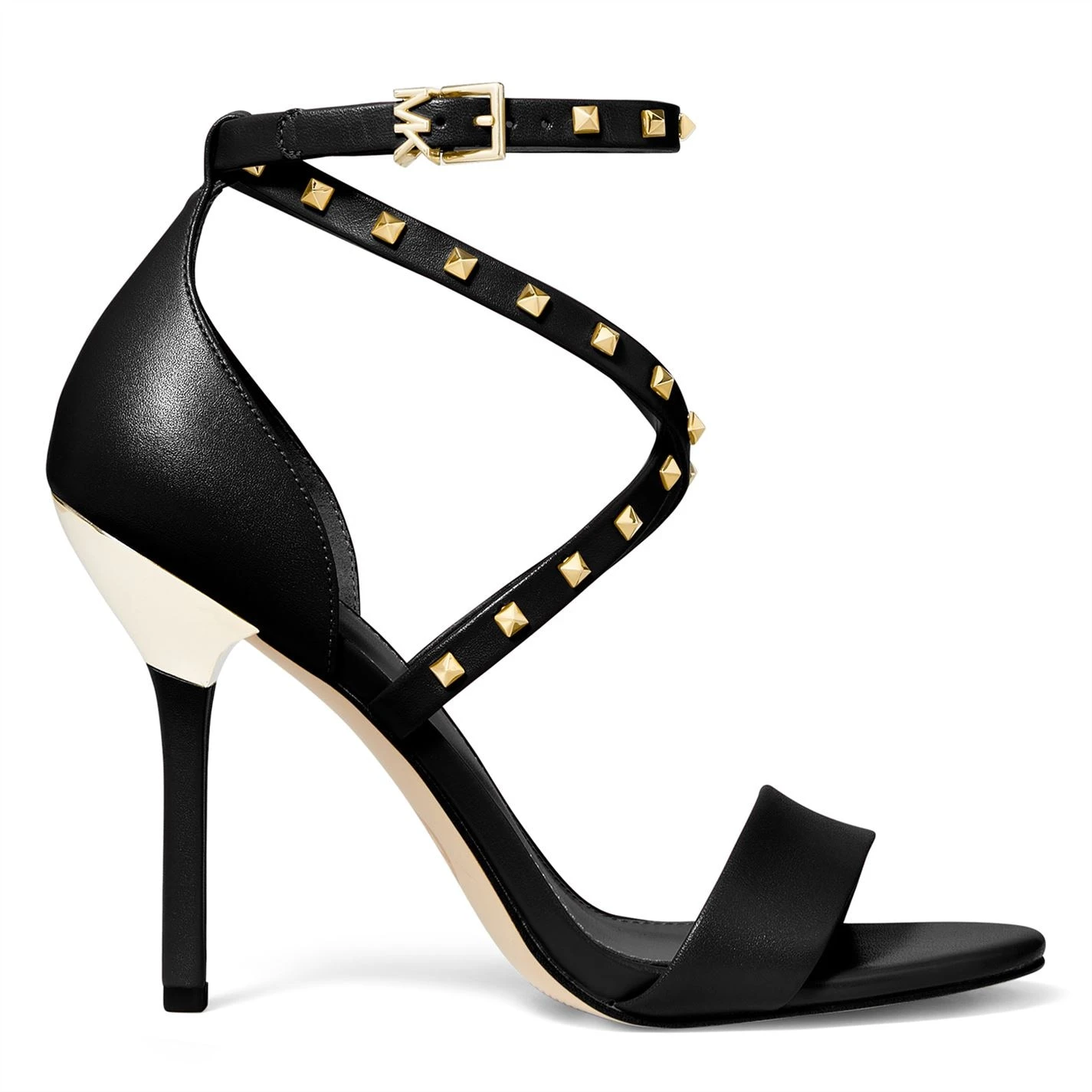Refresh your occasion footwear with these sleek heels brought to you by Michael Michael Kors. Crafted from a smooth leather fabrication, this pair boast a cross-over strap to the upper embellished with gold-toned studs for a luxe touch. With an open toe and concealed heel, this pair are set upon a mid stiletto heel and are secured with a buckle fastening for an adjustable fit.