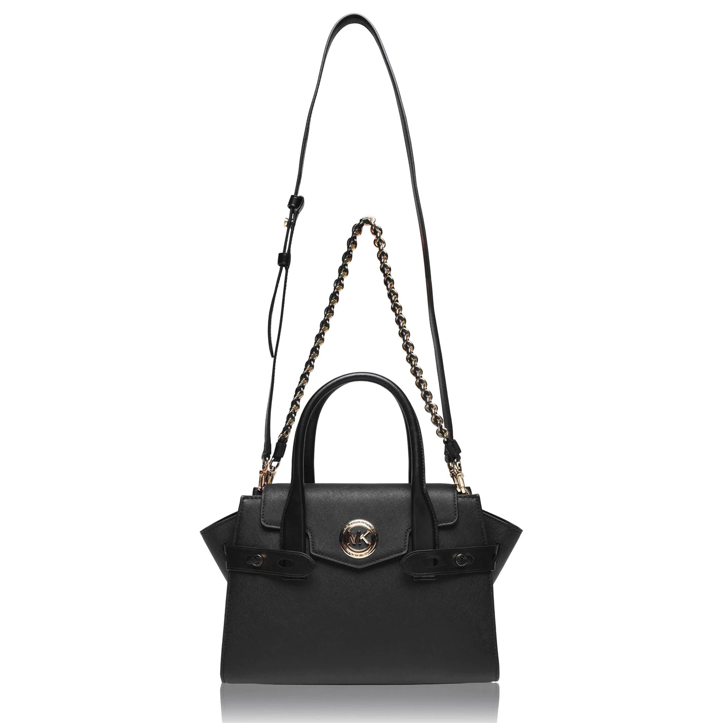 Spice up your everyday look courtesy of this michael Michael Kors Carmen Belted Satchel Bag. Realised in a pure-leather material, the bag features a detachable adjustable leather shoulder strap, top carry handles, inner pockets and magnetic fastening ensuring a secure closure. Accented with MICHAEL Michael Kors branding, this bag is the perfect urbane accessory for a sleek fashion sense.