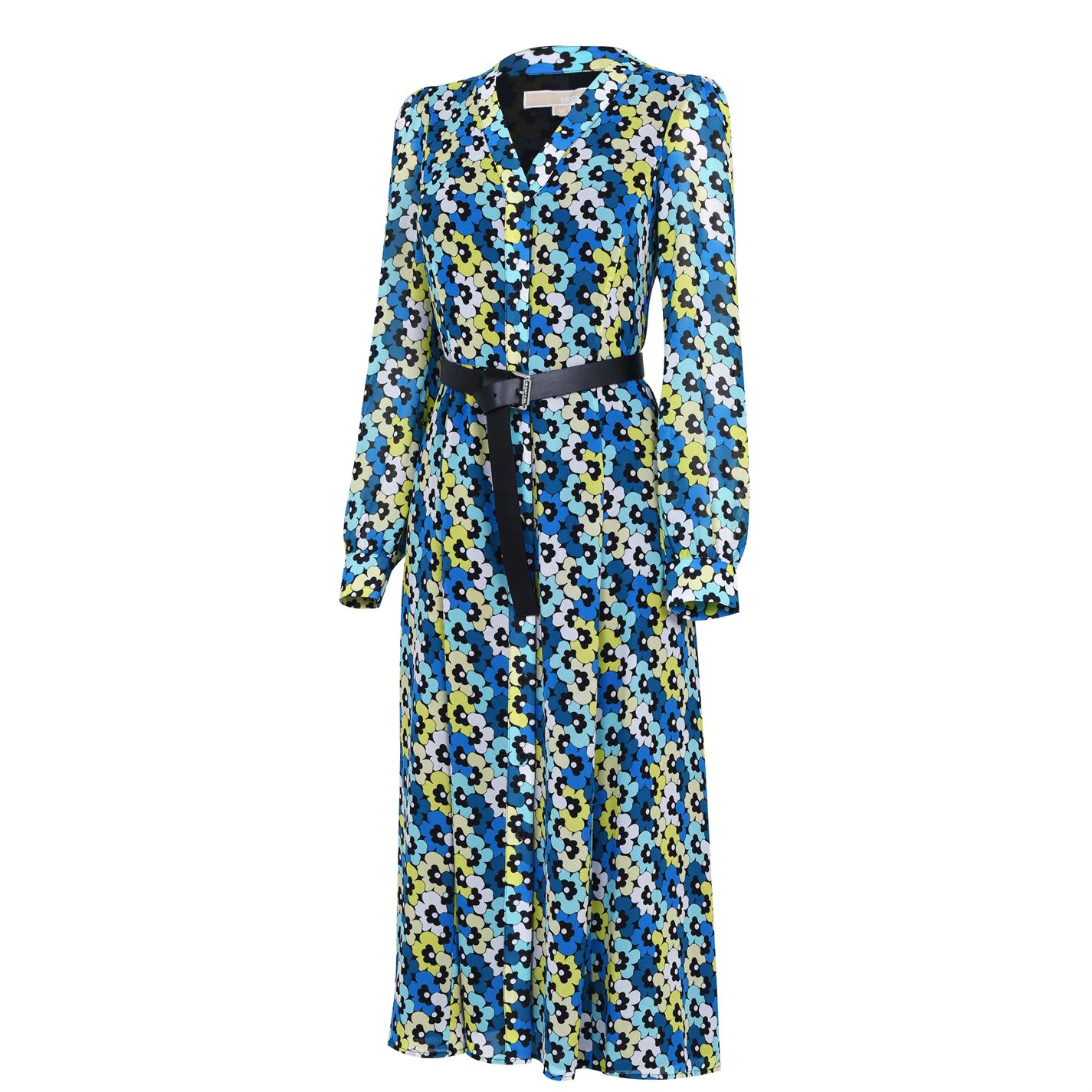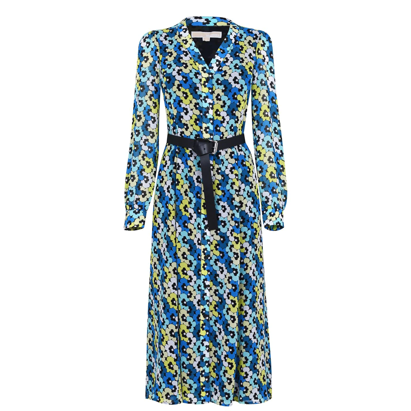 This Floral Kate Dress from michael Michael Kors would make a welcome addition to your collection. Crafted in a soft polyester material, this shirt dress features a v neckline, long sleeves, a central button down closure, buttoned cuffs and a curved hemline. The look is finished with an all over printed floral design, a leather belt included and the MICHAEL Michael Kors brand.