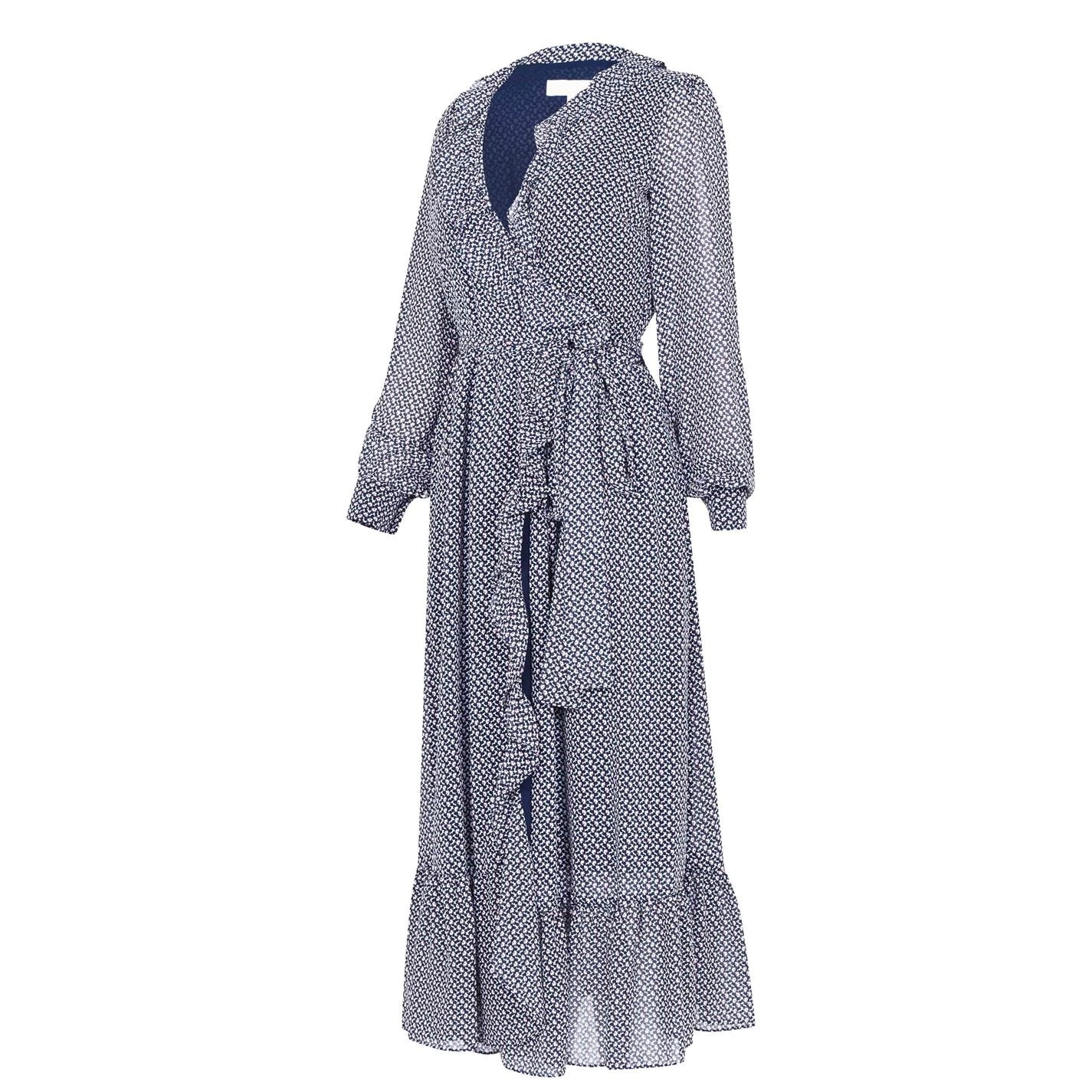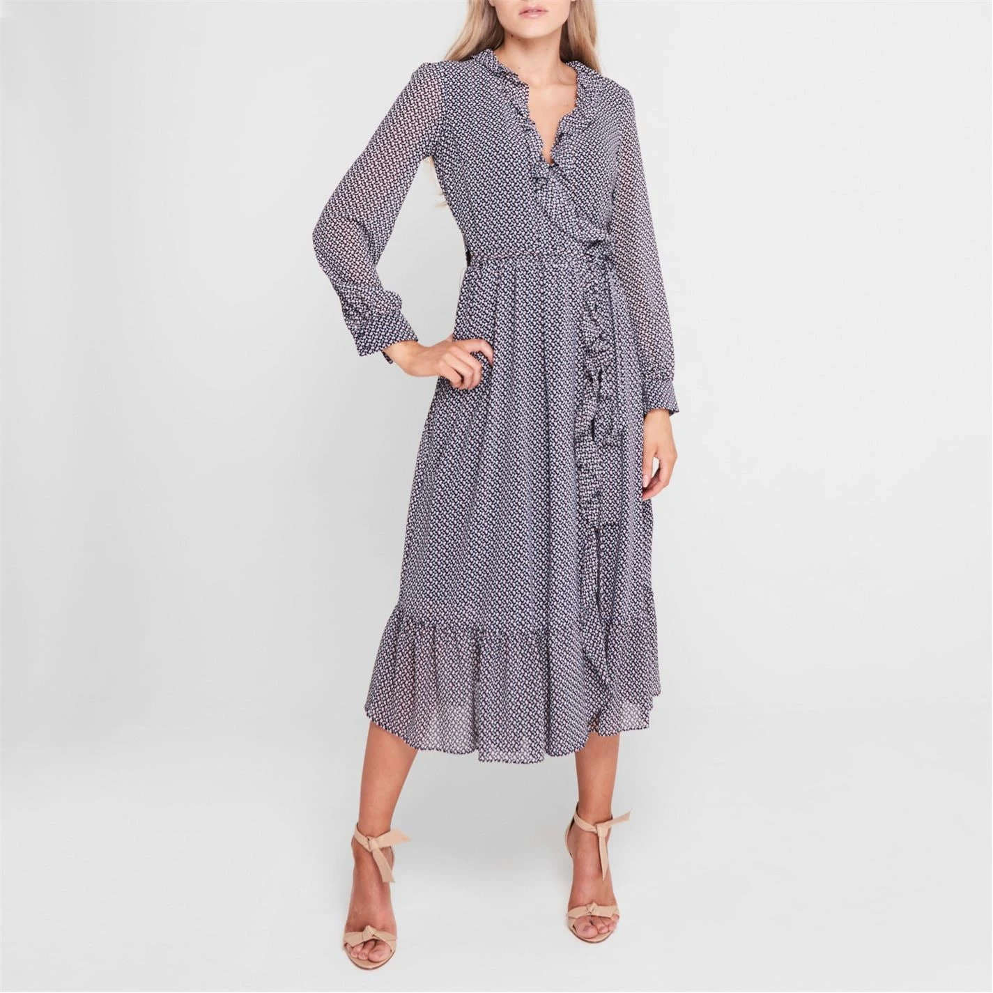 The Michael Michael Kors Long Sleeve Floral Midi Dress is perfect for cooler summer nights, featuring a long sleeve construction with a wrap around design and tie fastening. Waterfall detail to the skirt coupled with a fliral print completes this ensemble.