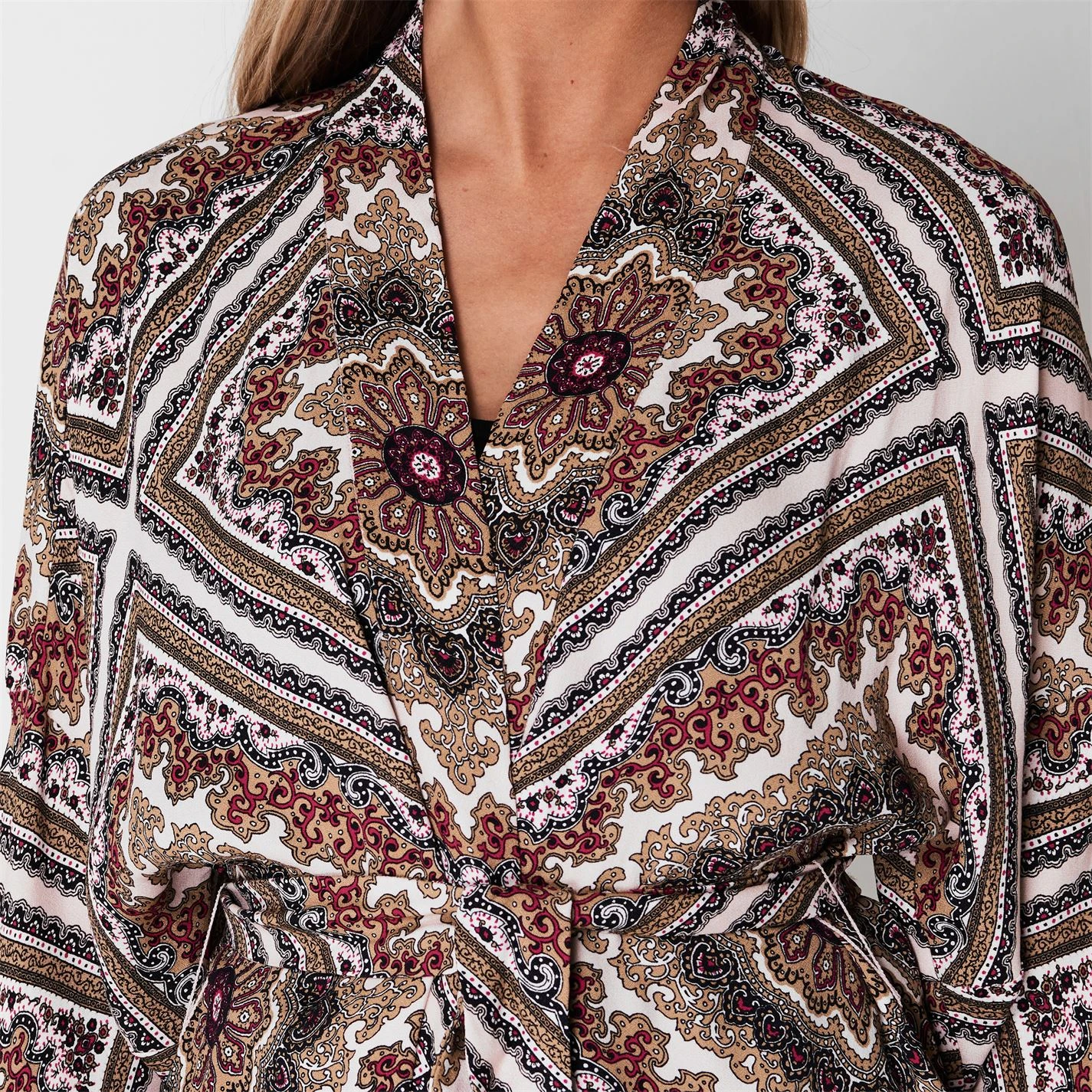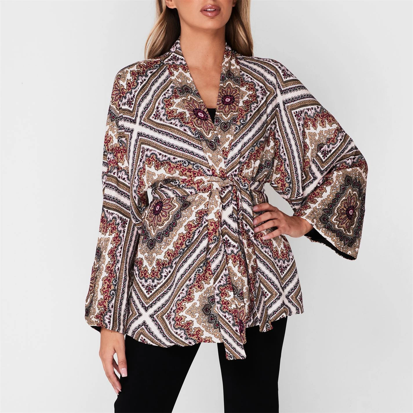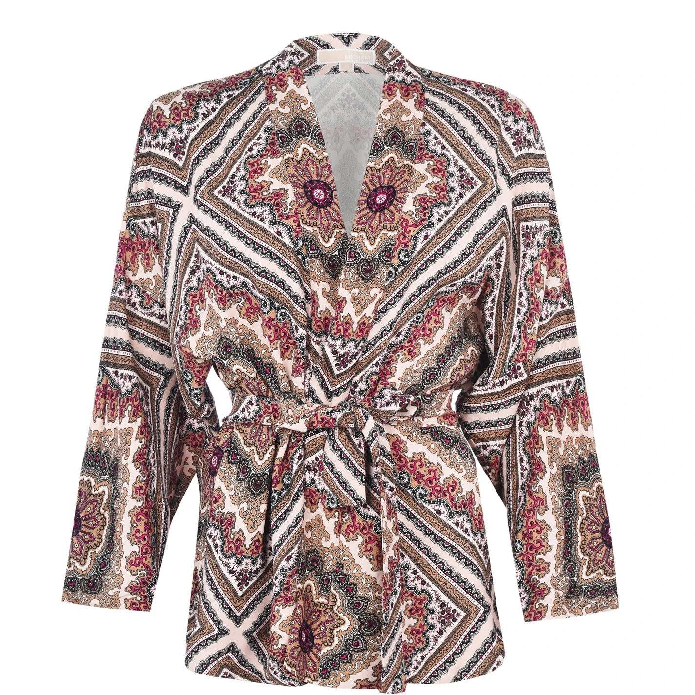 Complete your stylish ensemble with the Michael Kors Medal Kimono. Constructed with a relaxed lapel and tie waist for a classic look whilst the long wide sleeves and vintage print give the kimono a trendy finish which will be sure to compliment your attire.