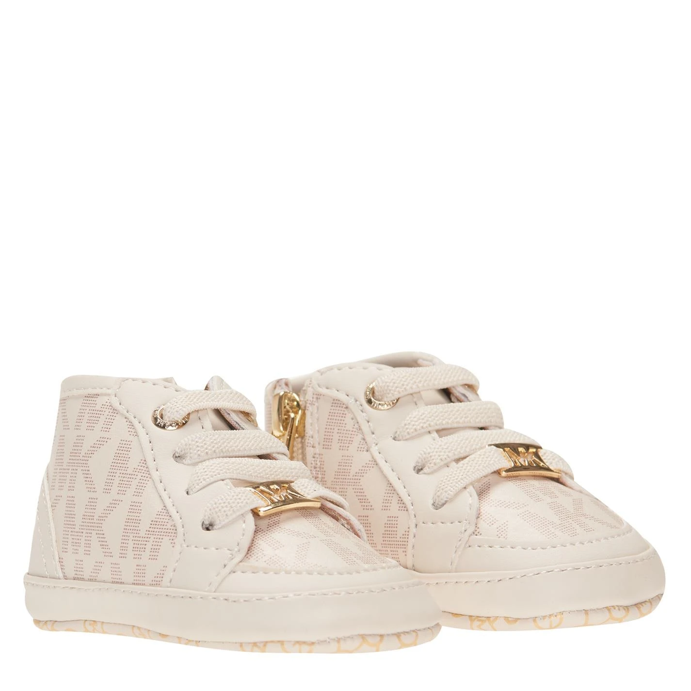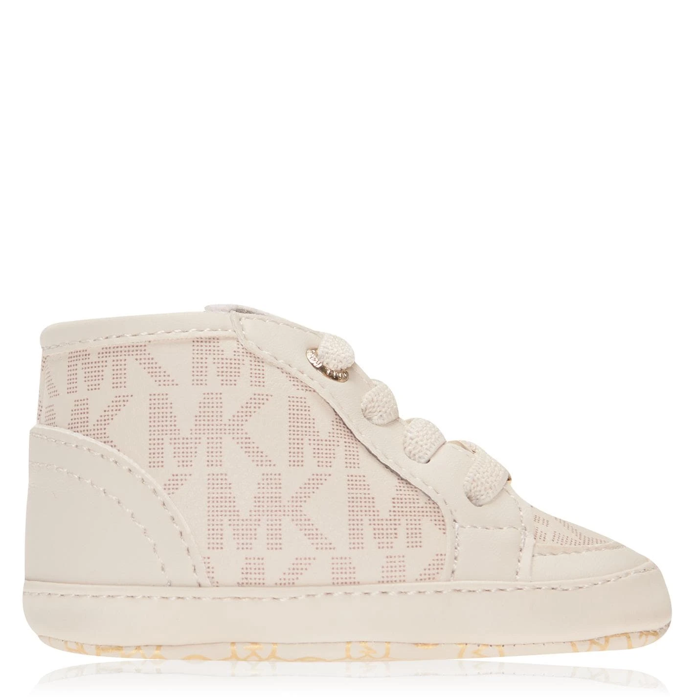 Invest in your little one’s wardrobe with the Michael Kors Ollie Crib Shoes. A high top construction with lace detailing and a side zip fastening to help achieve an easy on and off. The all-over monogram print will add a luxe aesthetic to your baby’s outfit with the gold toned hardware completing the design.