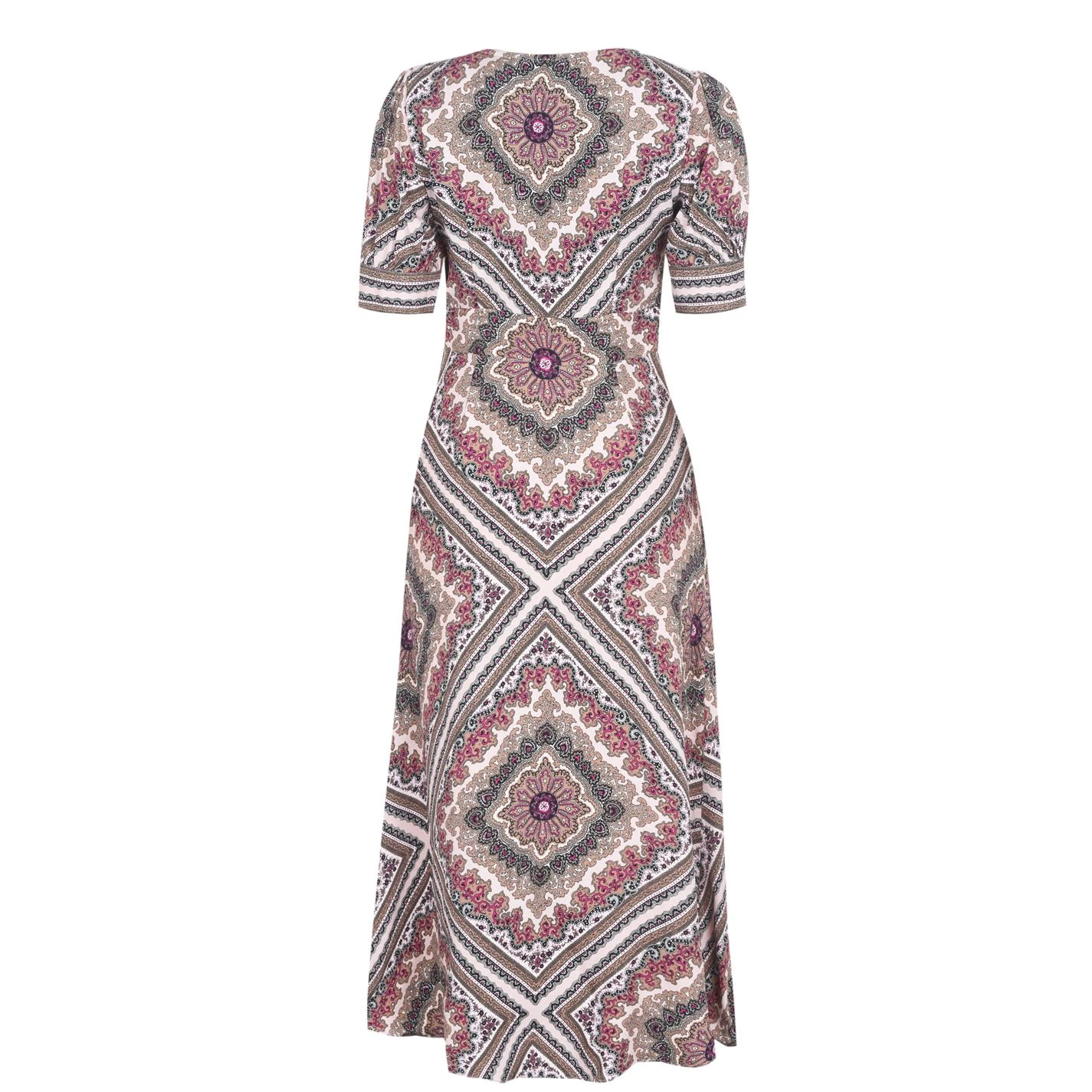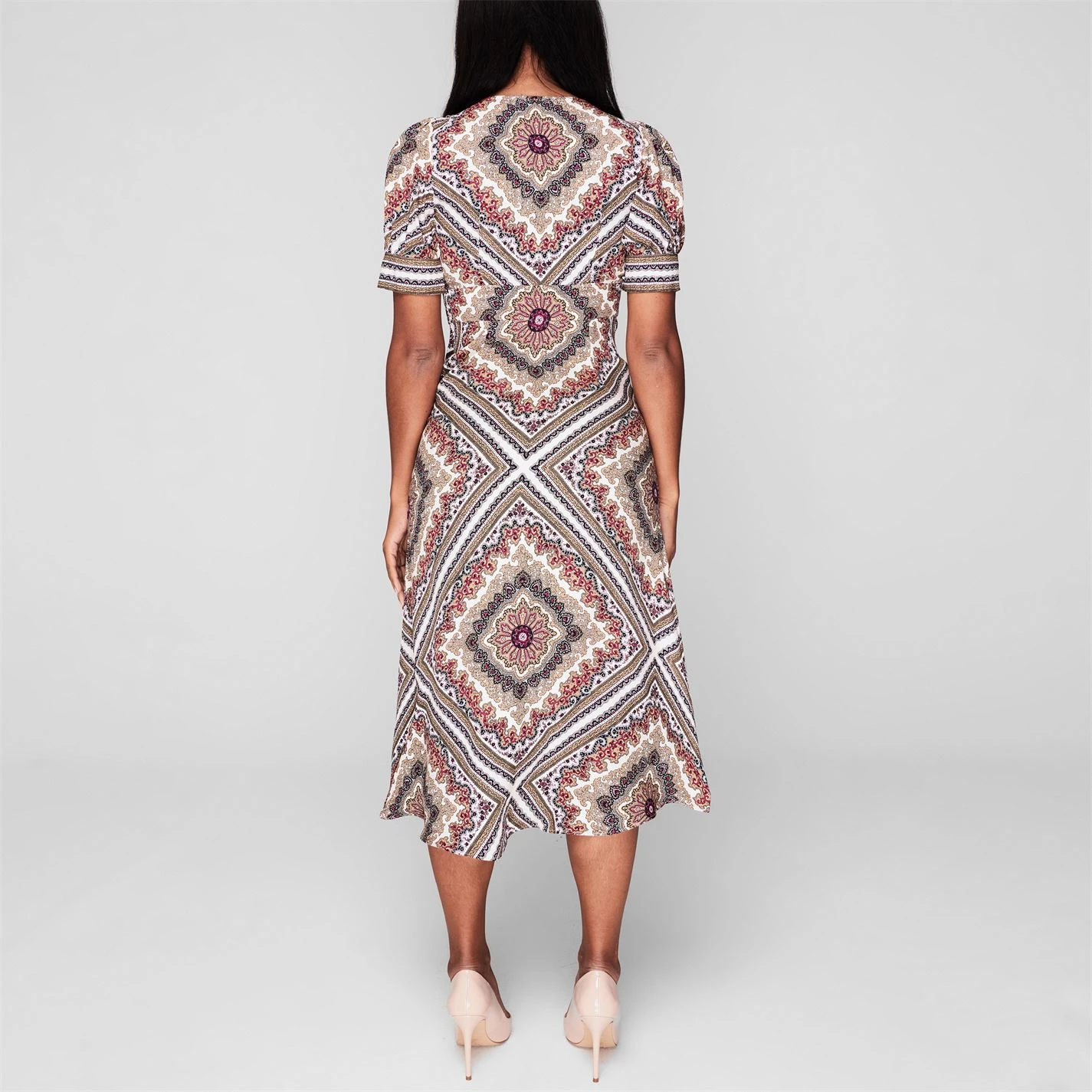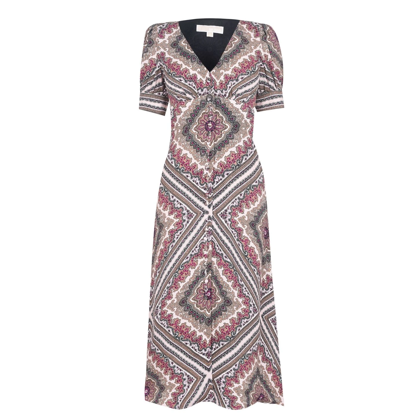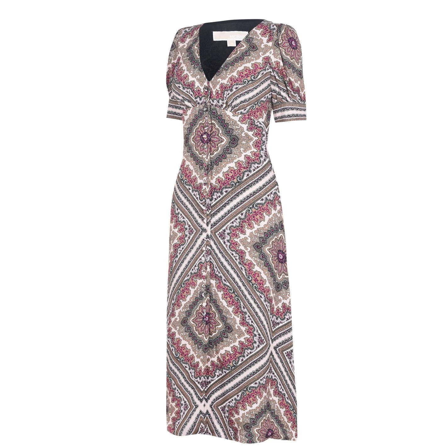 Upgrade your dress wardrobe with this Michael Kors Puff Sleeve Midi Dress, featuring a new romantic print style. The design hugs the torso before flowing out towards the hem, creating a flattering silhouette, aided by the elegant v-neckline. Fabric-covered buttons fasten the dress through the chest, while the puffed short sleeves add a further dimension to the piece.