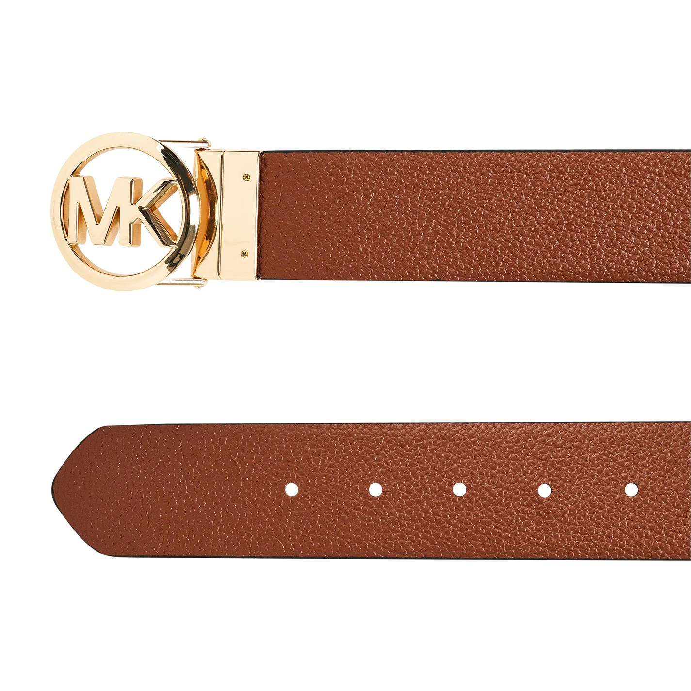 Update your designer accessories with this Round Buckle Reversible Belt by Michael Michael Kors. Designed with a textured and shiny leather, this belt would create the perfect finishing touch to your outfit. With a reversible design allowing for more styling options, the belt is finished with the gold-toned MK monogram buckle for instant brand recognition and a high quality appeal.
