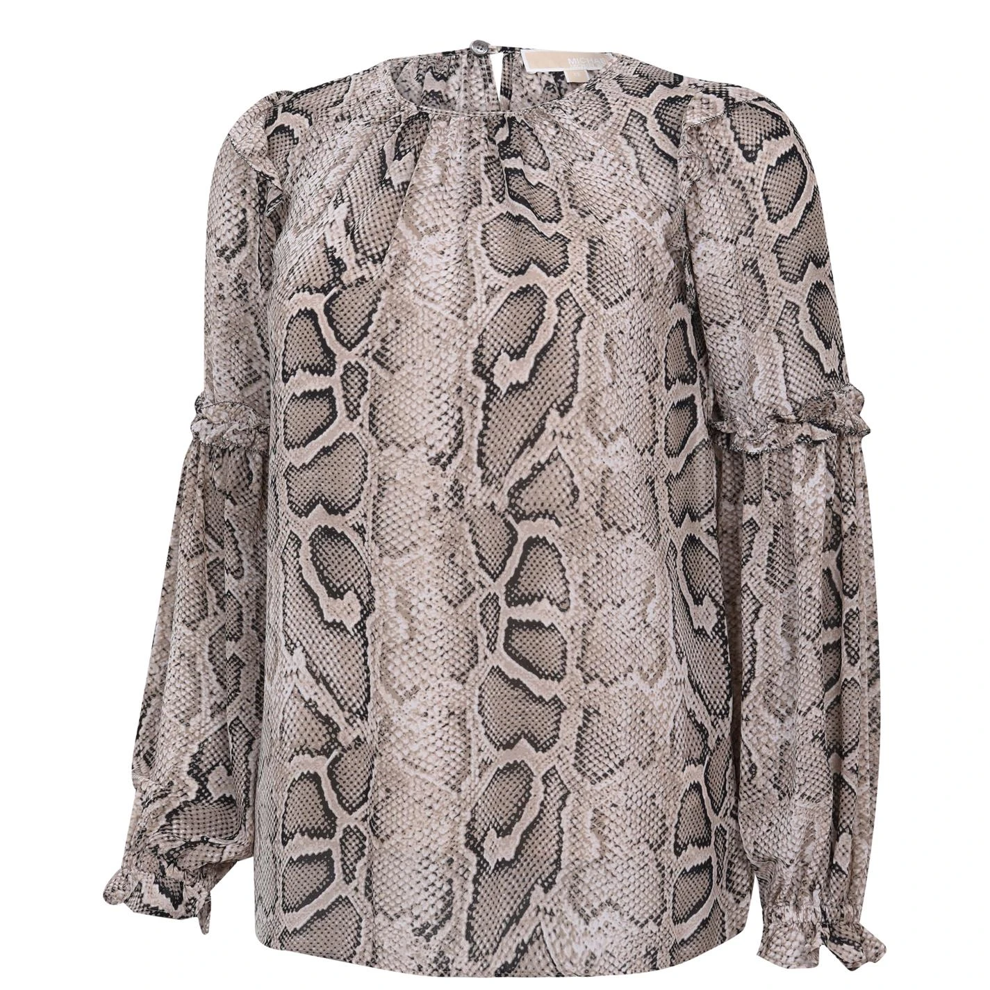 Enhance your collection with this MICHAEL Michael Kors Snake Ruffle Long Sleeve Blouse. Constructed with a crew neckline and long sleeves with comfortable elasticated hems for a classic look, it features back button fastening for a secure fit. This blouse is an all over print design with a signature logo and is complete with MICHAEL Michael Kors branding.