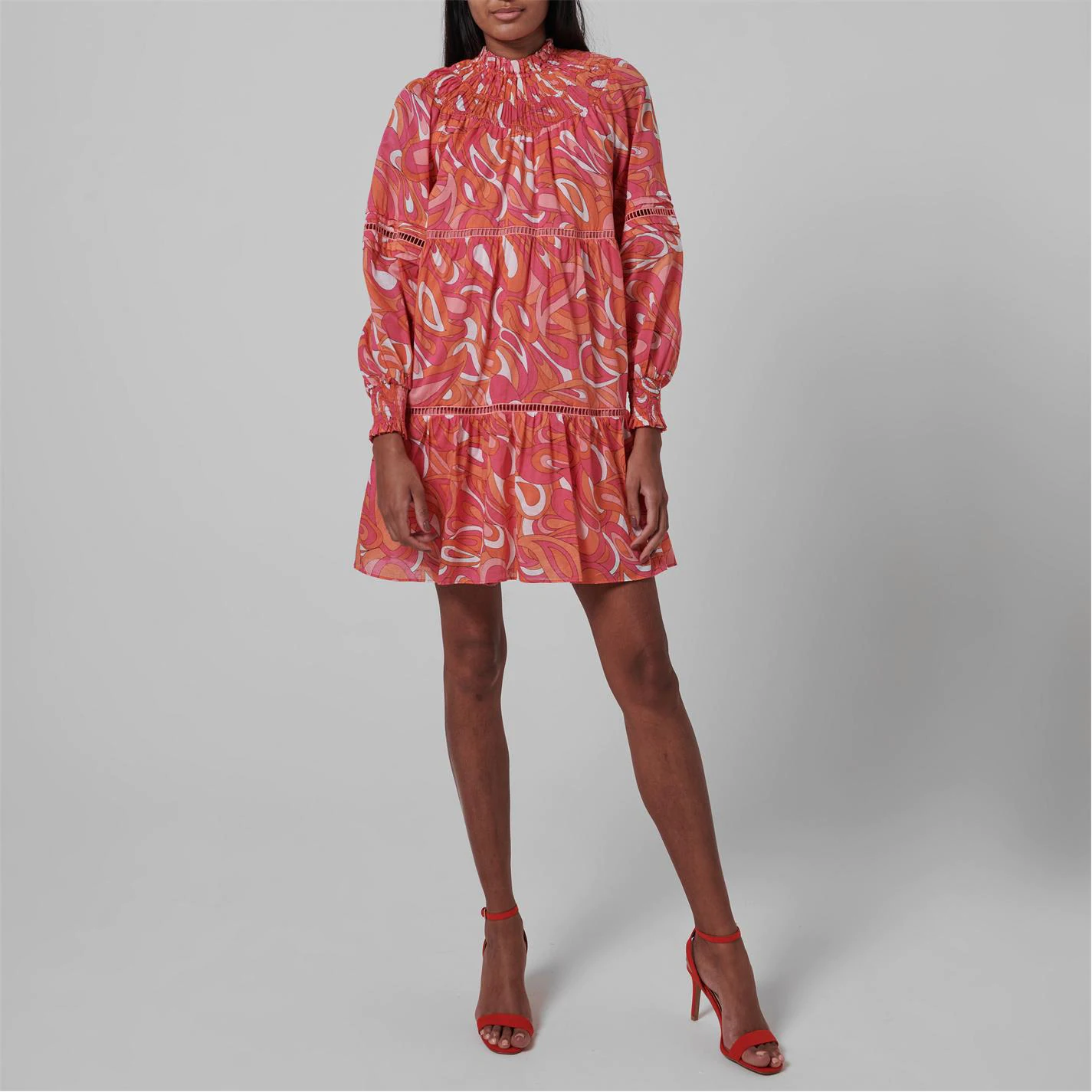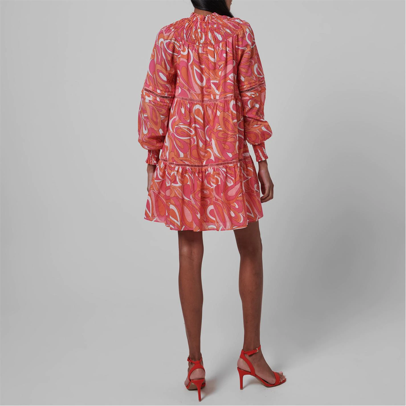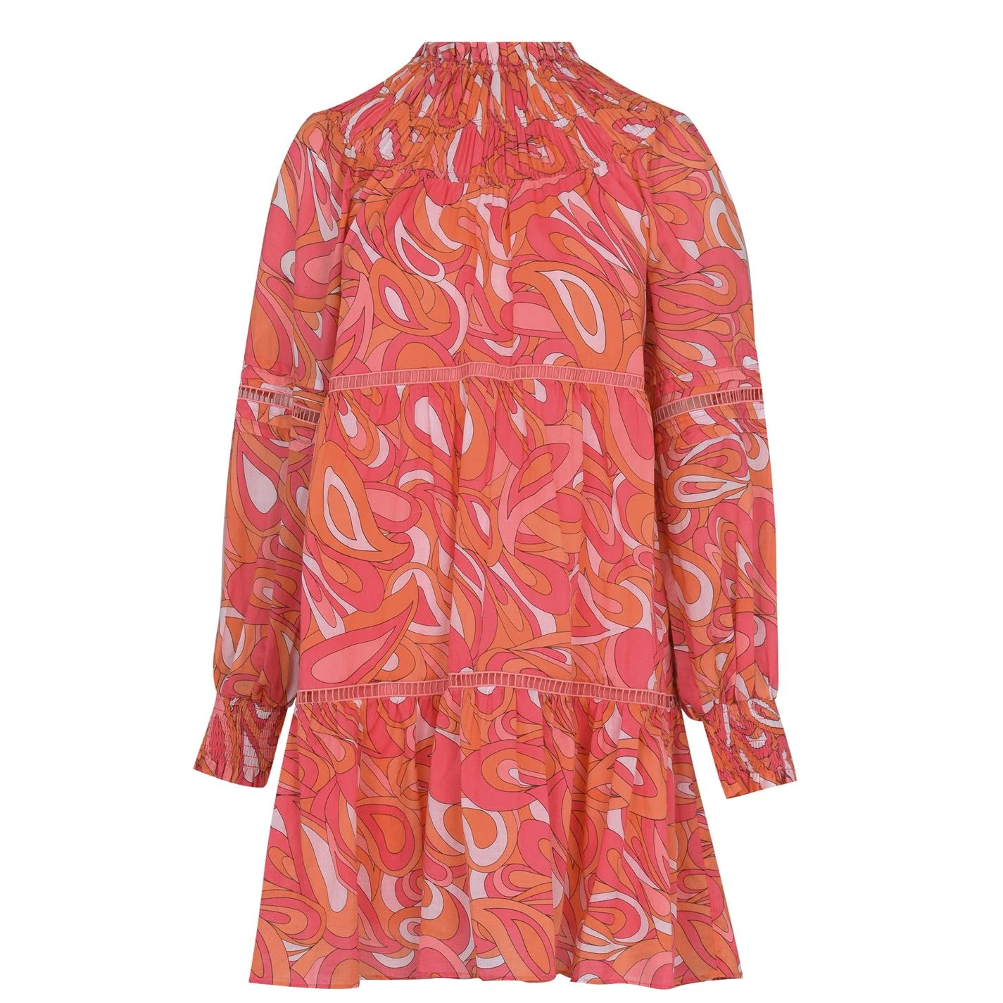 Add a vibrant print to your daytime dresses with the Swirl Mini Dress from Michael Kors. Featuring a psychedelic swirl print and tiered cut, this dress adds a 70’s style aesthetic to a modern cut dress. With long shirred cuff sleeves and neckline, style this mini with minimal accessories to keep all attention on this bold statement dress.
